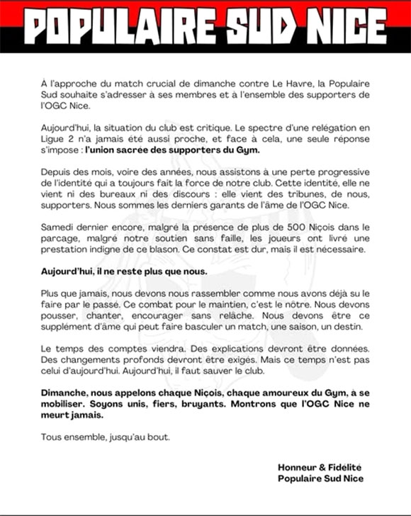 À l’approche du match crucial contre Le Havre dimanche prochain, la Populaire Sud fait un communiqué pour alerter sur la situation critique du Gym. Le groupe appelle à une union totale pour pousser l’équipe vers le maintien. Dimanche, tous les supporters sont invités à se mobiliser pour sauver le club.