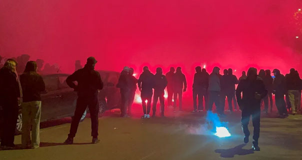 Des fumigènes sont d'abord allumés, puis des chants hostiles sont repris pour demander notamment aux joueurs de "se bouger le c...". Plusieurs dizaines de forces de l'ordre sont présentes pour assurer la sécurité des membres du club, qui commencent à descendre du bus au milieu d'une foule très dense.
