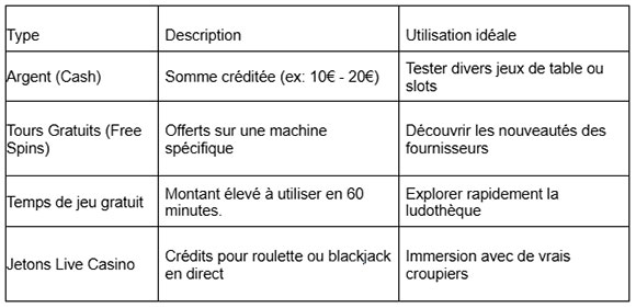 Il existe plusieurs formes de gratifications gratuites adaptées à chaque profil de joueur. Voici un aperçu des options disponibles sur un casino online avec bonus sans dépôt :